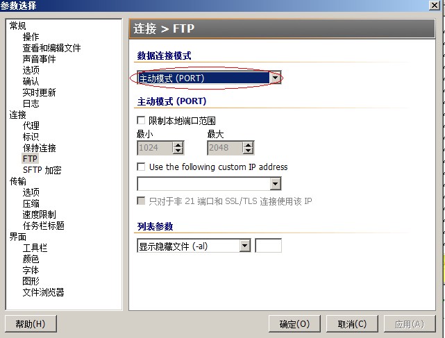 我关了防火墙了之后问题依旧,于是看看FlashFXP4.0的“选项”–>“参数选择”–>“连接”–>“FTP”里,在“数据连接模式”,但是我默认的即使“被动模式(PASV)”的,于是就我就改成“主动模式(PORT)”,然后“确定”,如图。